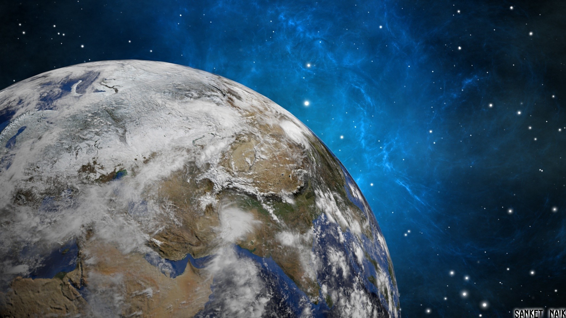 Beyaz bulutlarla karanlık uzayda bir gezegen