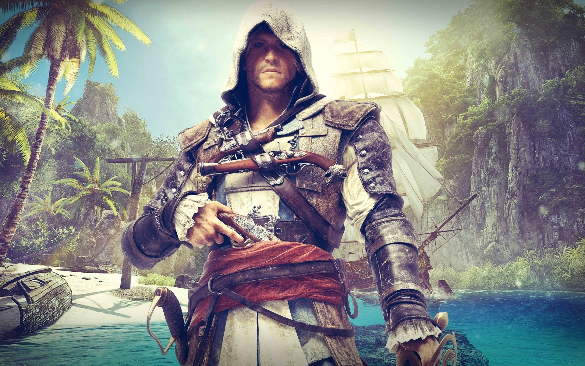 Assassin`s creed. Palmiye ağaçlarıyla sahilde gezgin