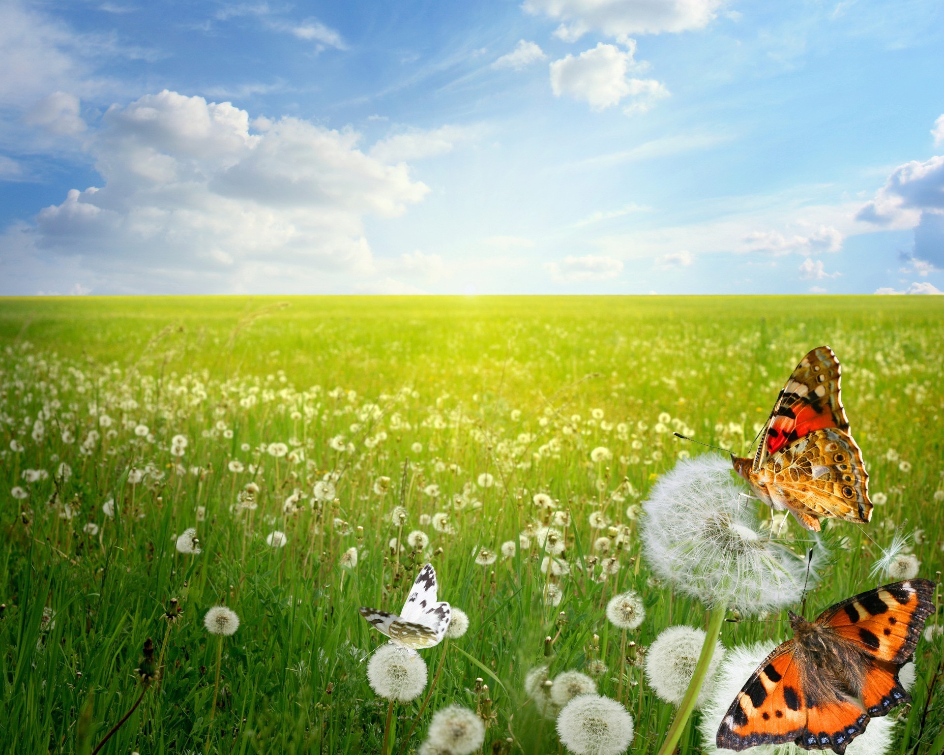 Tarladaki kabarık karahindiba üzerindeki kelebekler