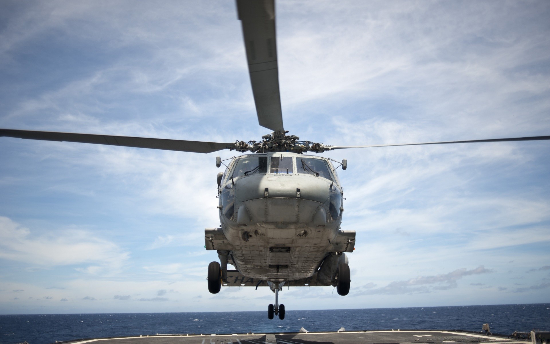 Kayaların arasından geçen yollarda iki spor otomobil sürüyor, helikopter üzerlerinde asılı duruyor