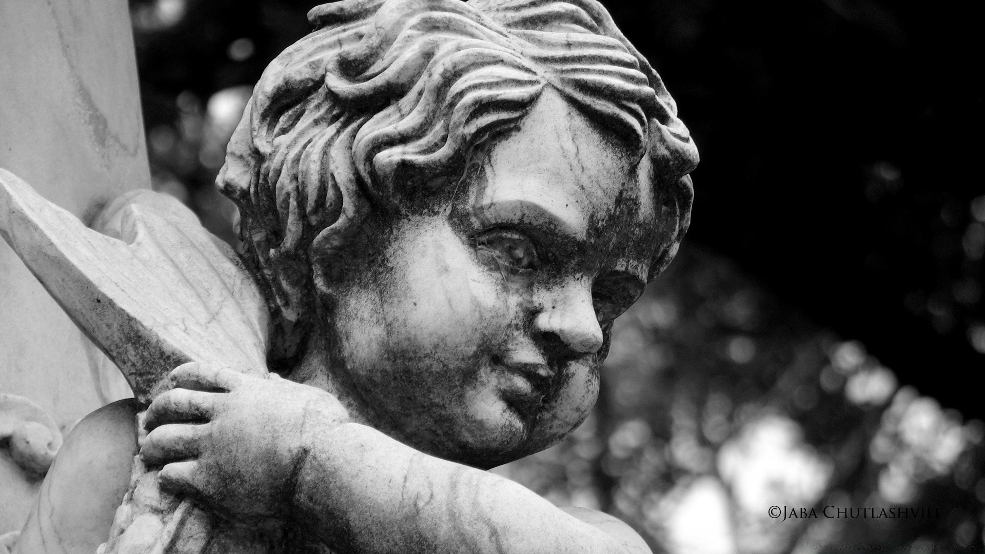 Meleğin yüzü siyah beyaz bir taş zemine karşı