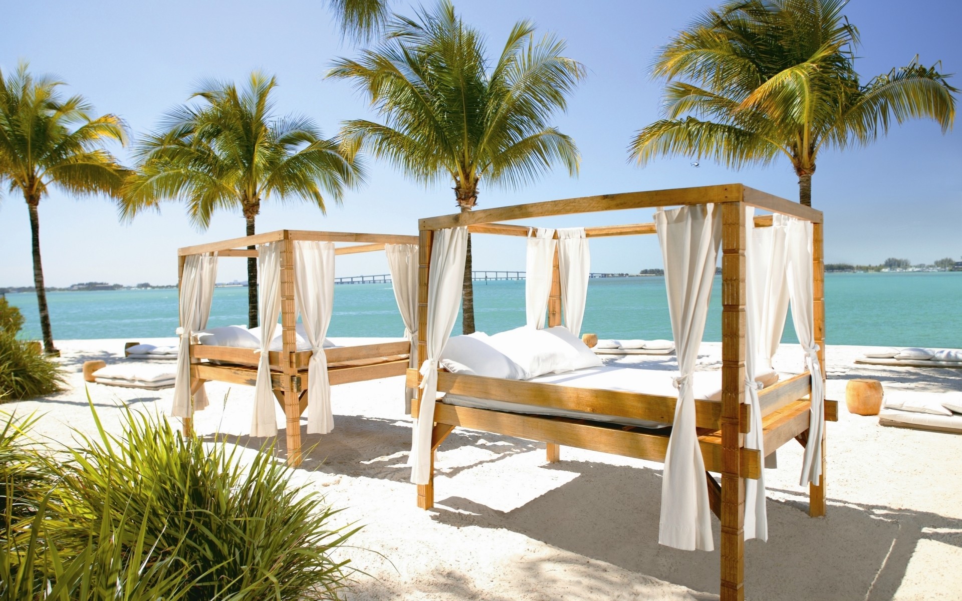 Plaj, gökyüzü, deniz ve palmiye ağaçları, romantizm
