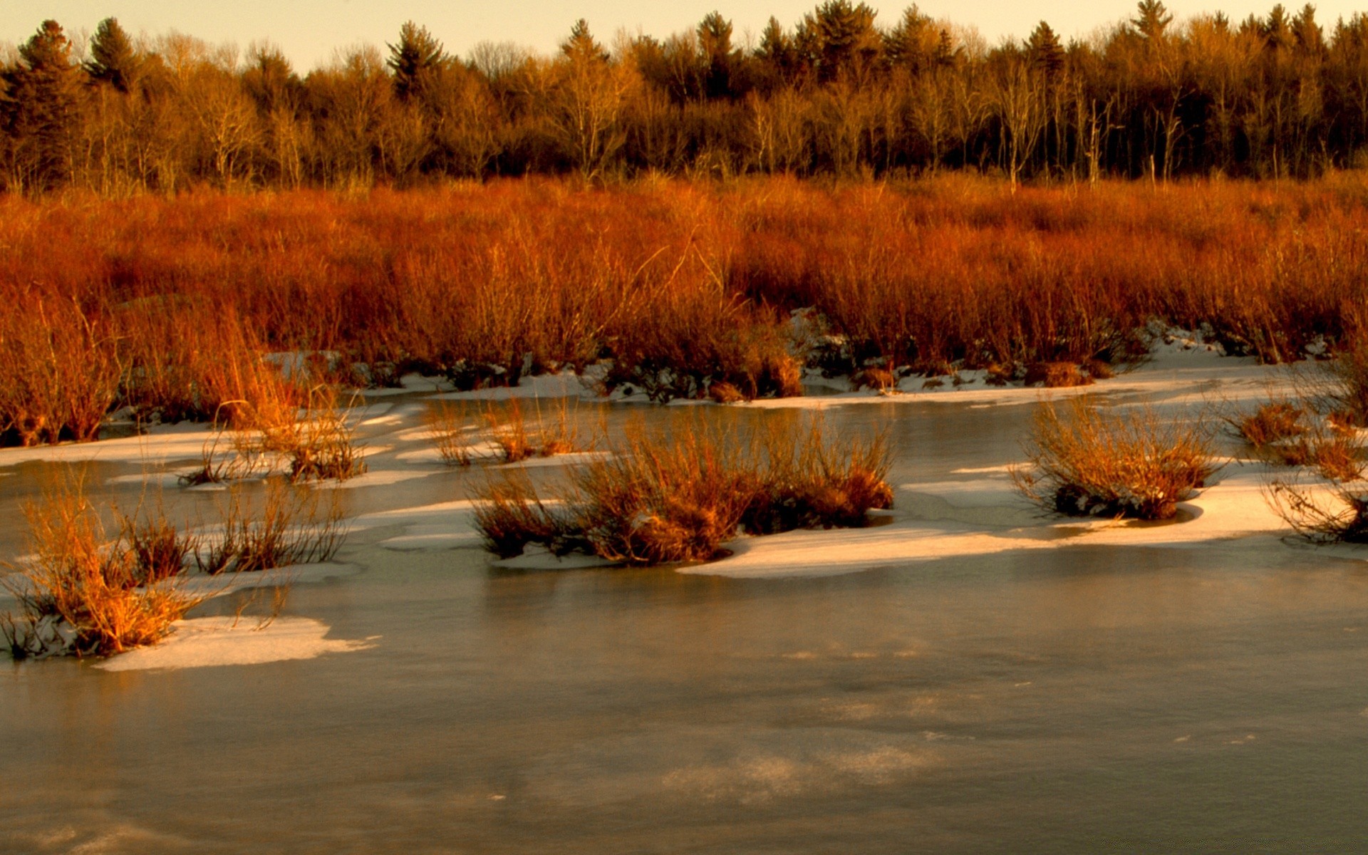 Sonbahar orman manzarası. Bataklıktaki ilk kar