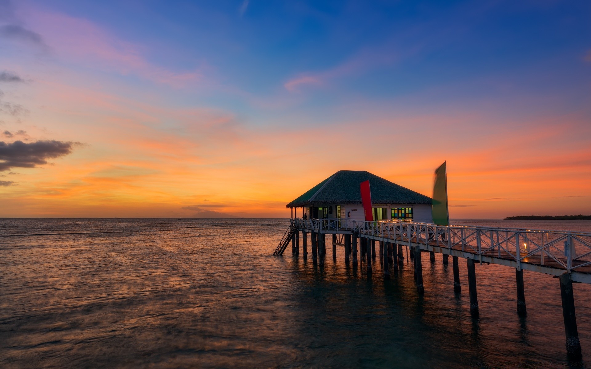 Güzel gün batımı manzarası. okyanus suyunun üzerindeki ev