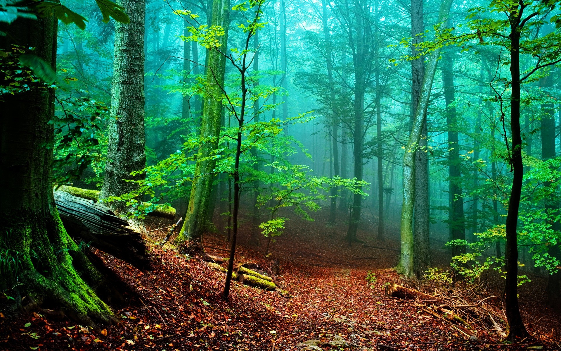 Turuncu yaprakları olan sisli bir ormandaki siyah ağaçlar
