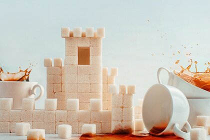 Ufalanmış kahve çekirdekleri arasında şekerli kahve
