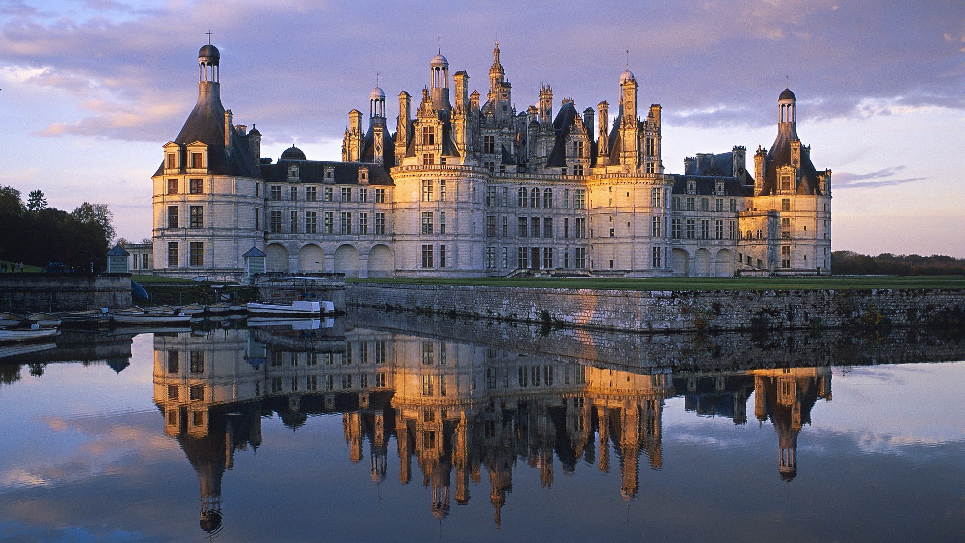 Gün batımında pembe ve mavi gökyüzünün arka planına karşı dağdaki büyük güzel kale