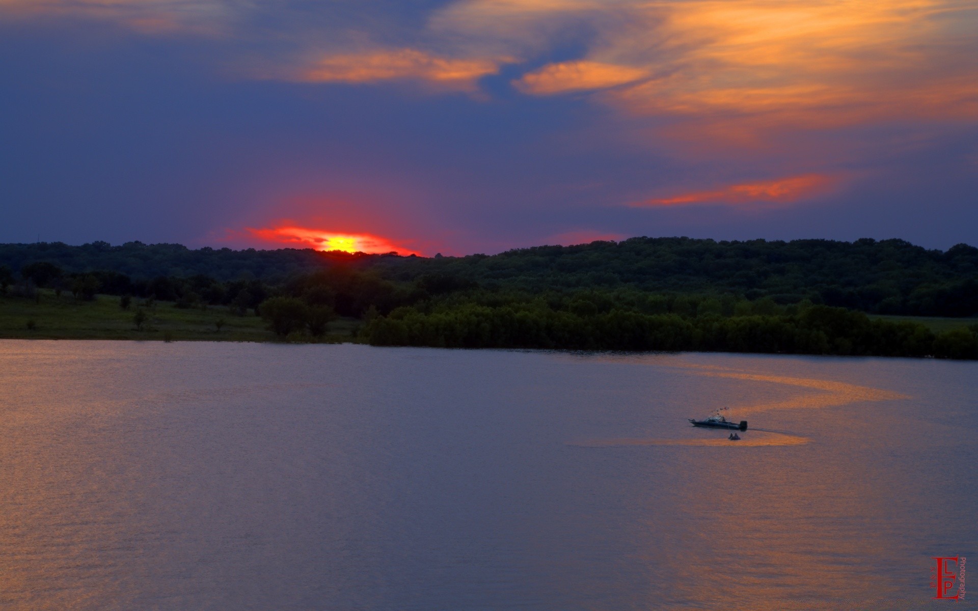 Güneşin batışı, gökyüzündeki bulutlarla suyun yanında