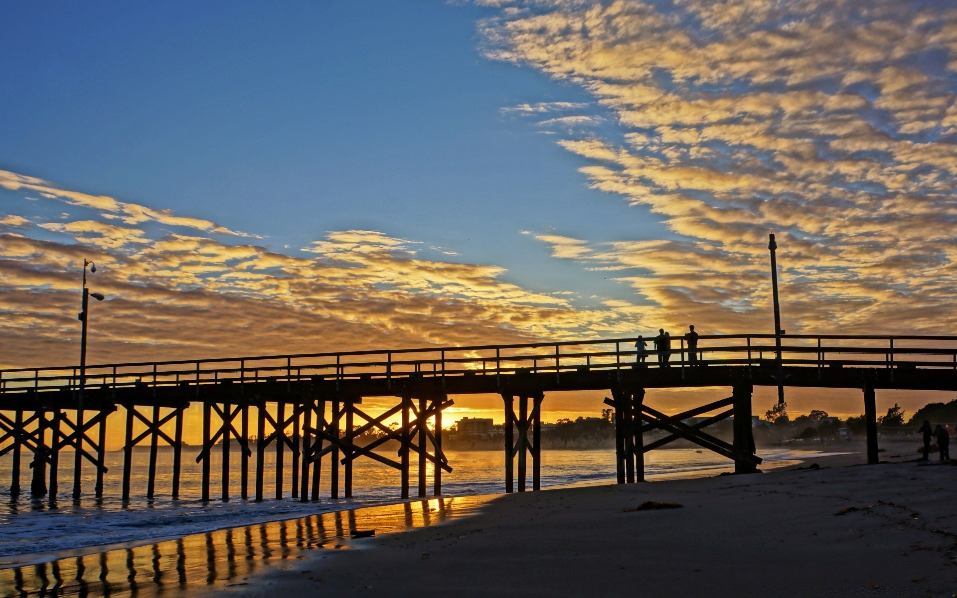 Sahilde ve köprünün arka planında denizde gün batımı