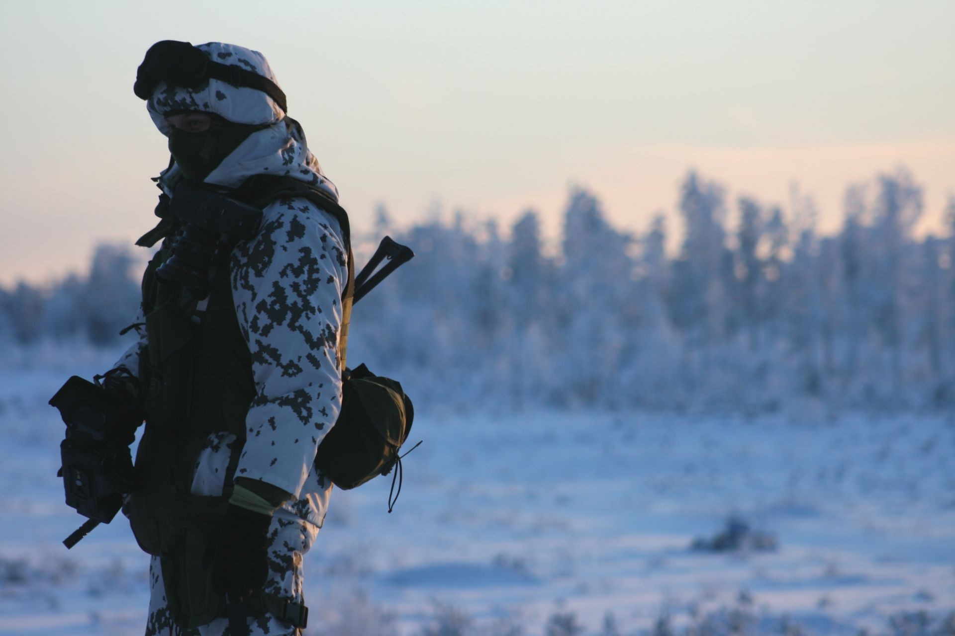 Kış manzarasının arka planına karşı kamuflajlı bir adam