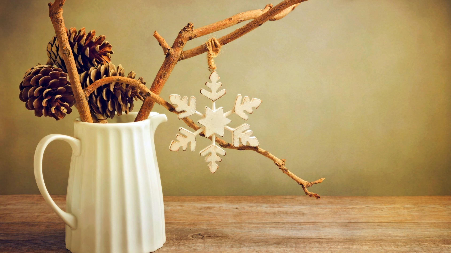 Sürahide dallar, çam kozalakları ve kar tanesi ile natürmort