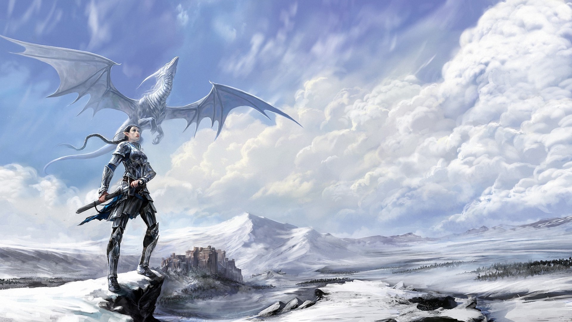 Yükselen bir ejderhanın arka planına karşı savaşan bir kız