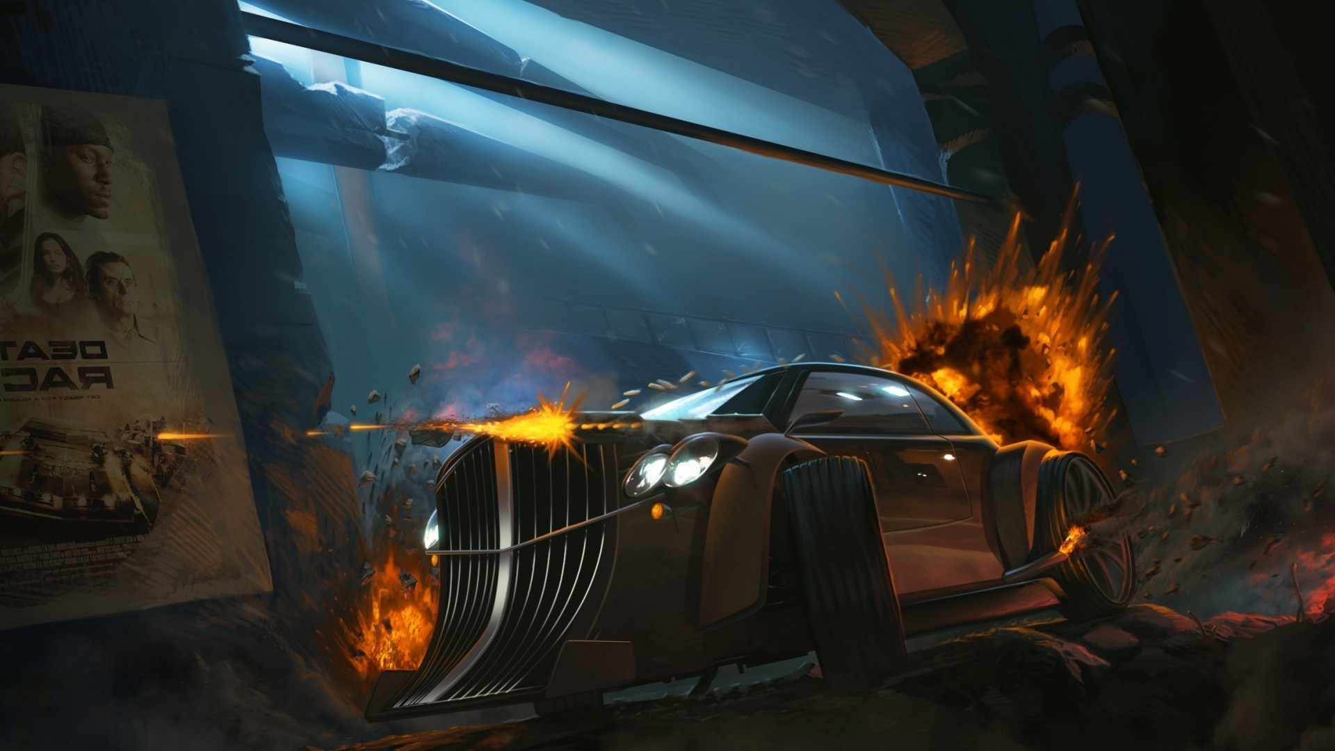 Büyük patlamanın arka planına karşı sarı bir araba