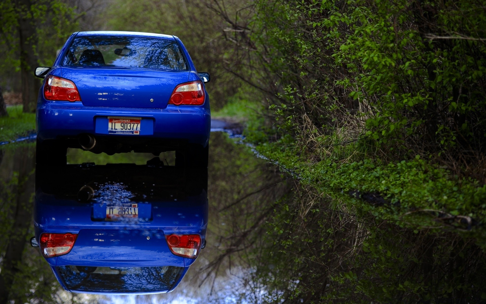 Islak yolda mavi araba