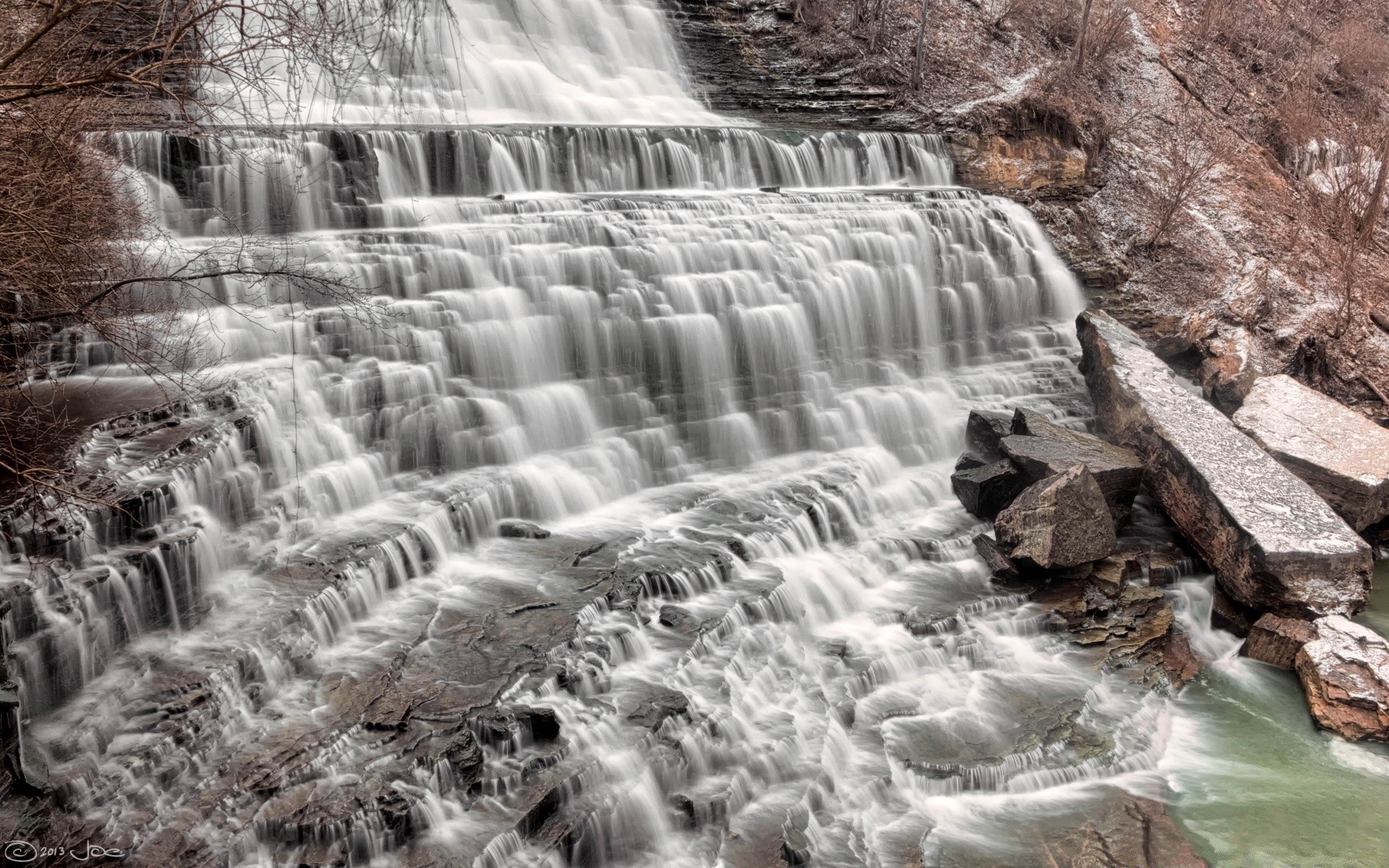 Avrupa'da nehir, ağaçların arasında şelaleler