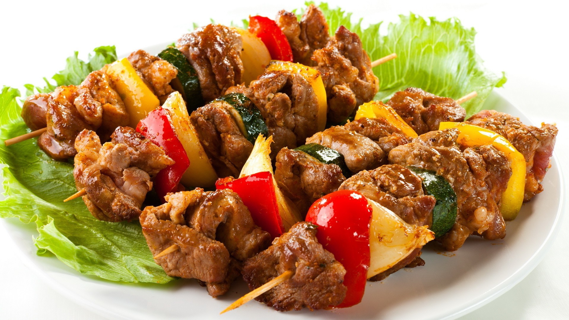 Marul yaprakları olan bir tabakta sulu şiş kebap