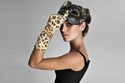 Siyah bir arka plana karşı göz alıcı bir elbiseli kadın
