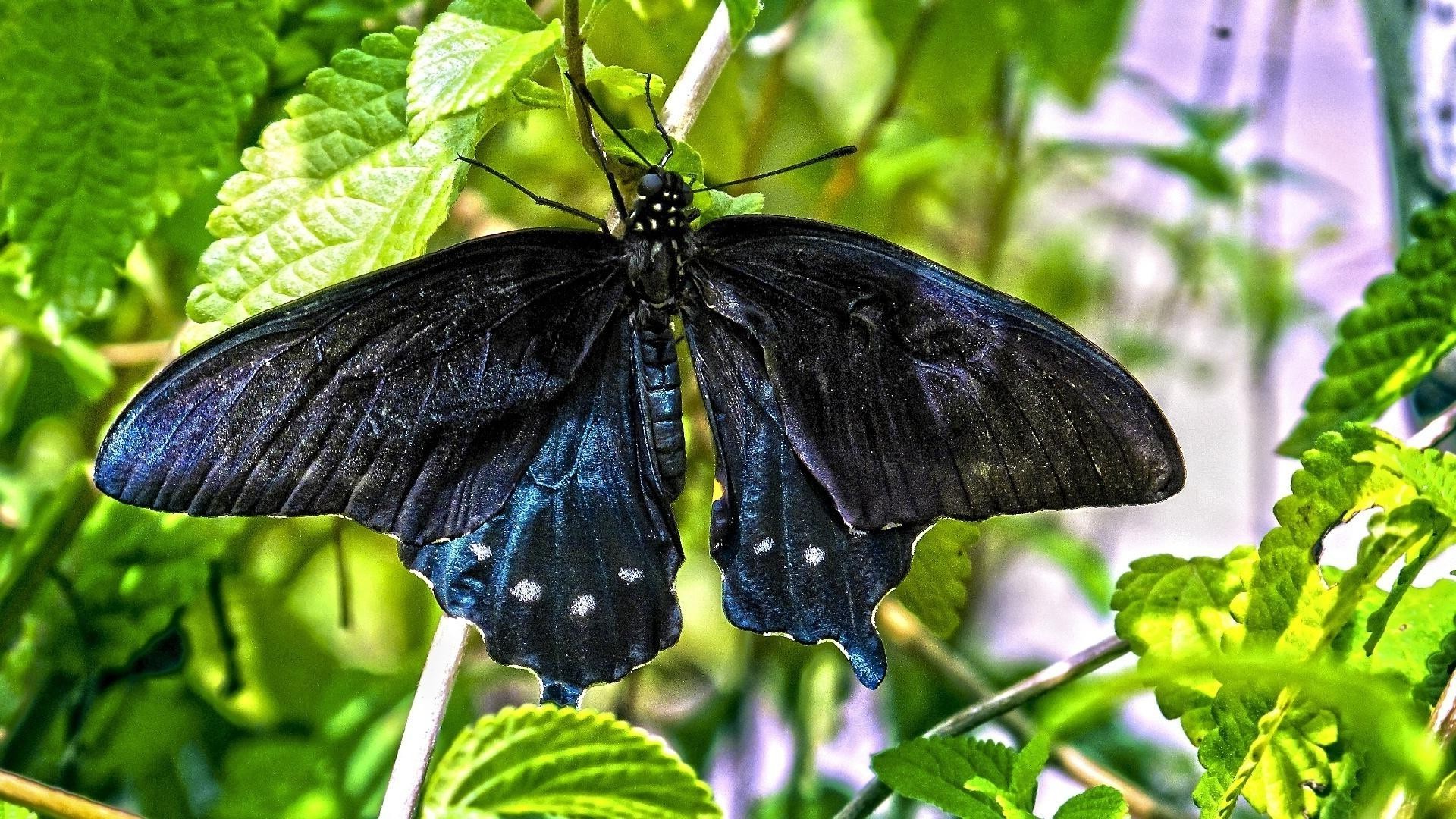 Yeşil yaprak üzerinde koyu renkli kelebek