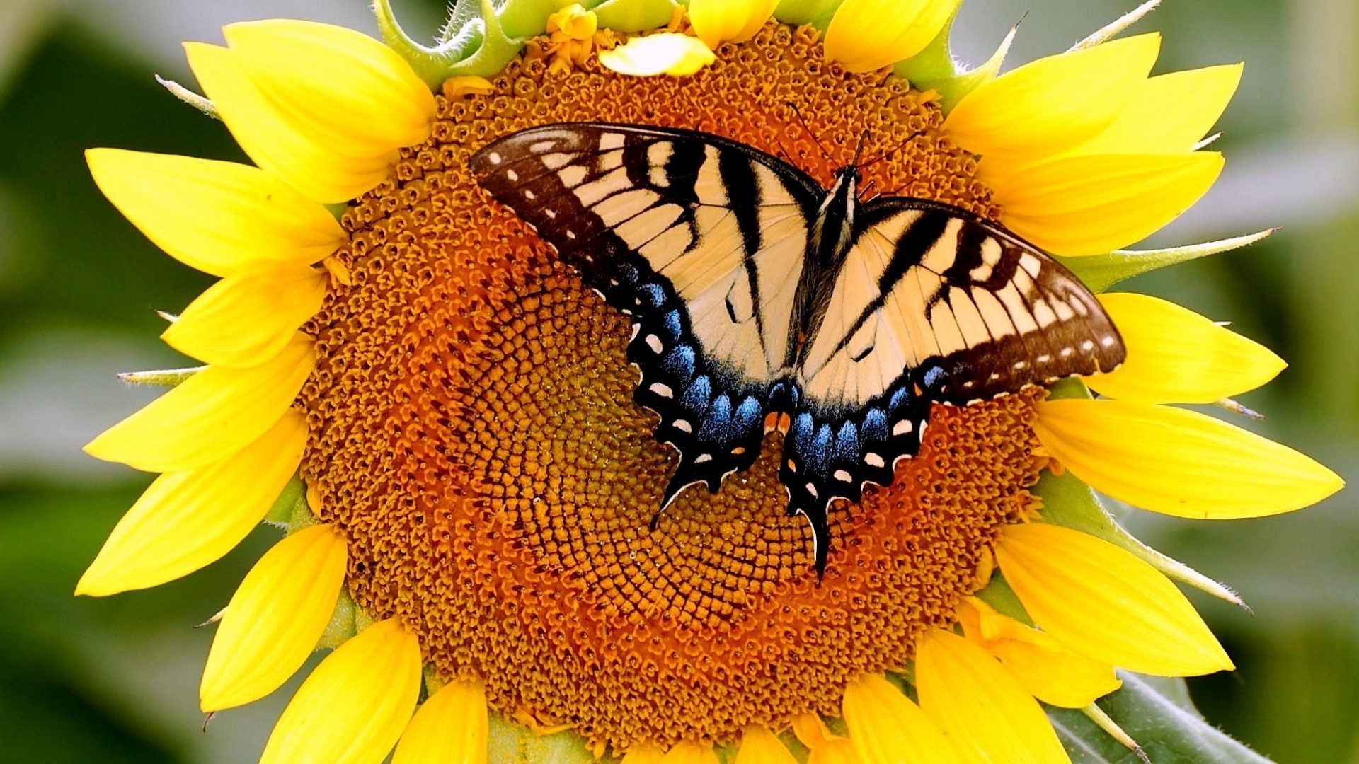 Çiçeğin üzerinde bir kelebek oturur, arka plan sarıdır, doğa iyidir