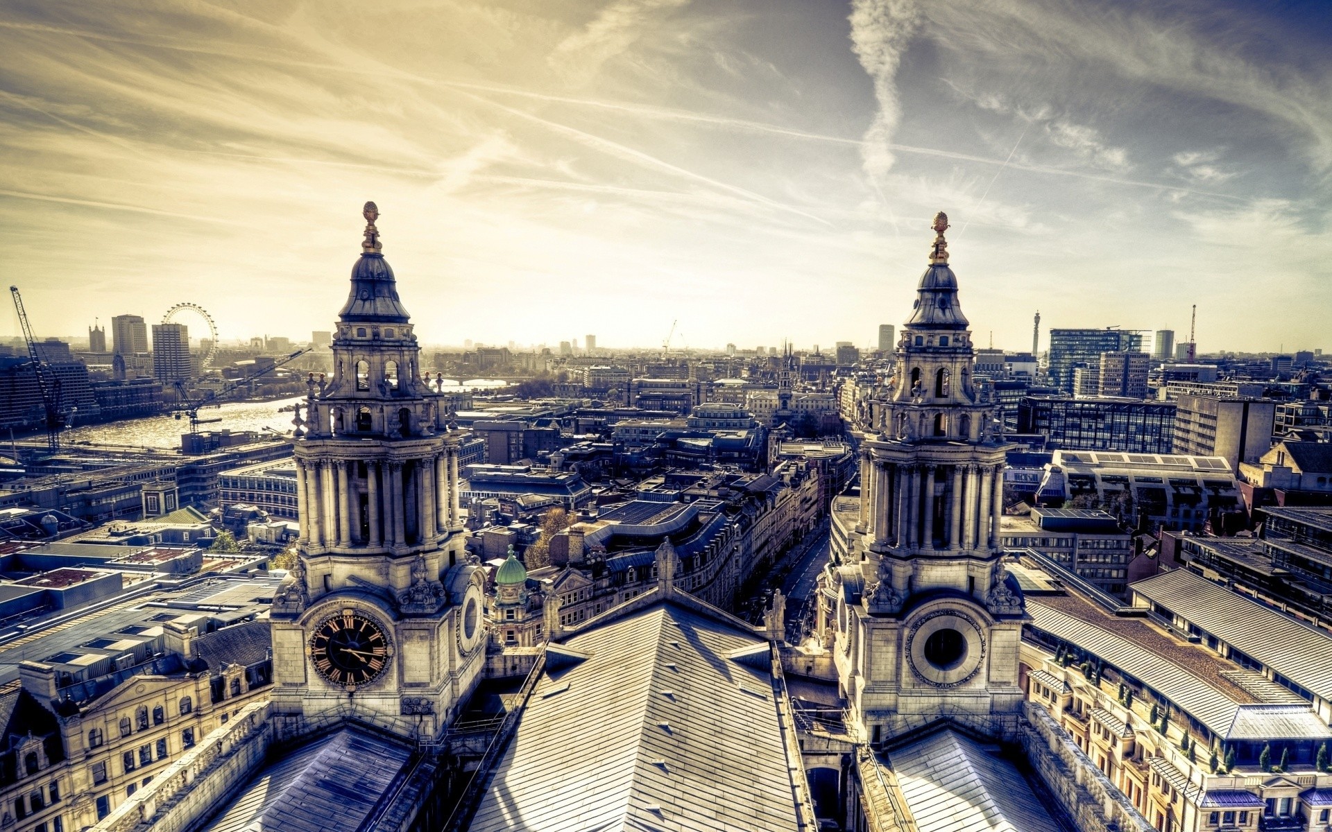 Bulutlu havalarda şehrin yukarısındaki saat kuleleri
