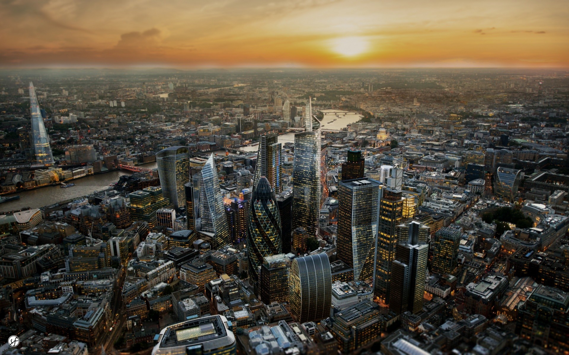 Gün batımında güzel bir şehir kuş bakışı ile