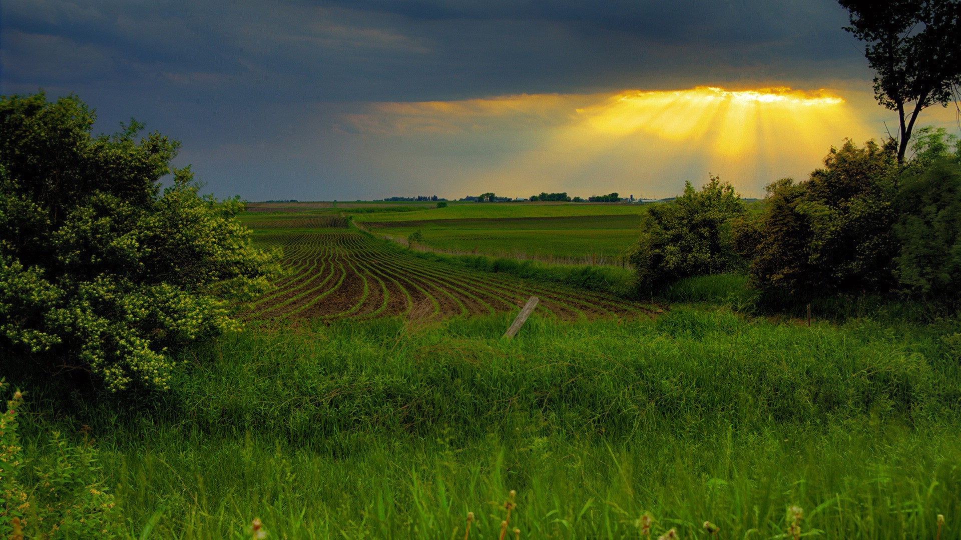 Gün batımında yeşil çimlerle tarlada kırmızı çiçekler