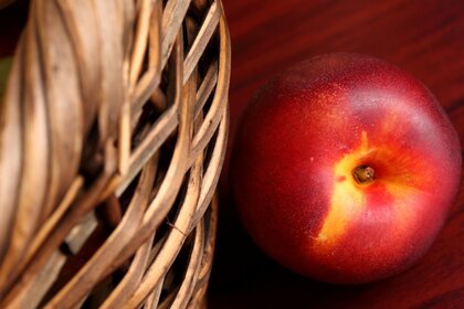 Masanın üzerindeki sepetin yanında sulu kırmızı nektarinMasanın üzerindeki sepetin yanında sulu kırmızı nektarin
