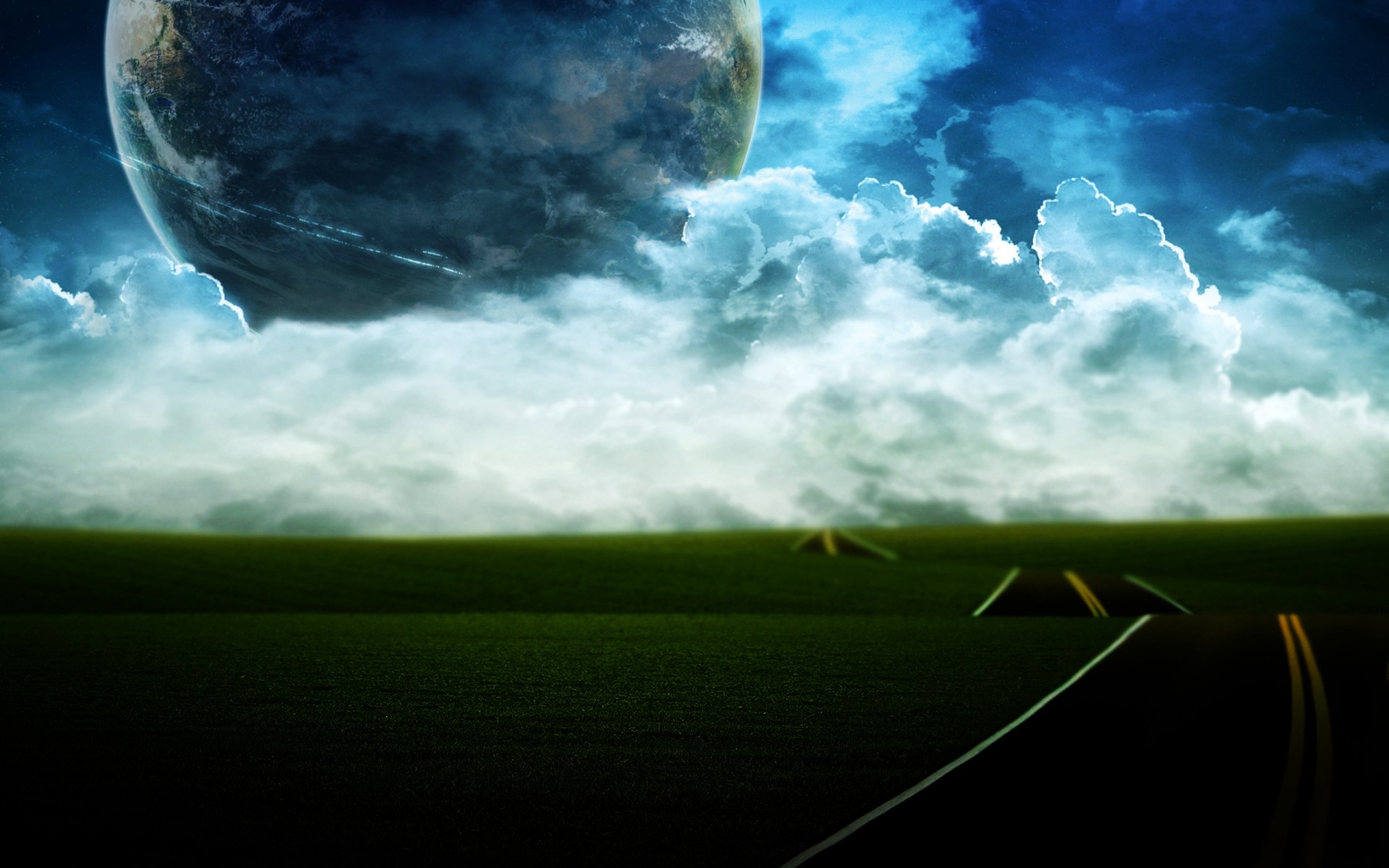 Alanın peyzajı, yolun bulutluluk ufkuna giden yolu ile, gökyüzünde büyük bir gezegen var