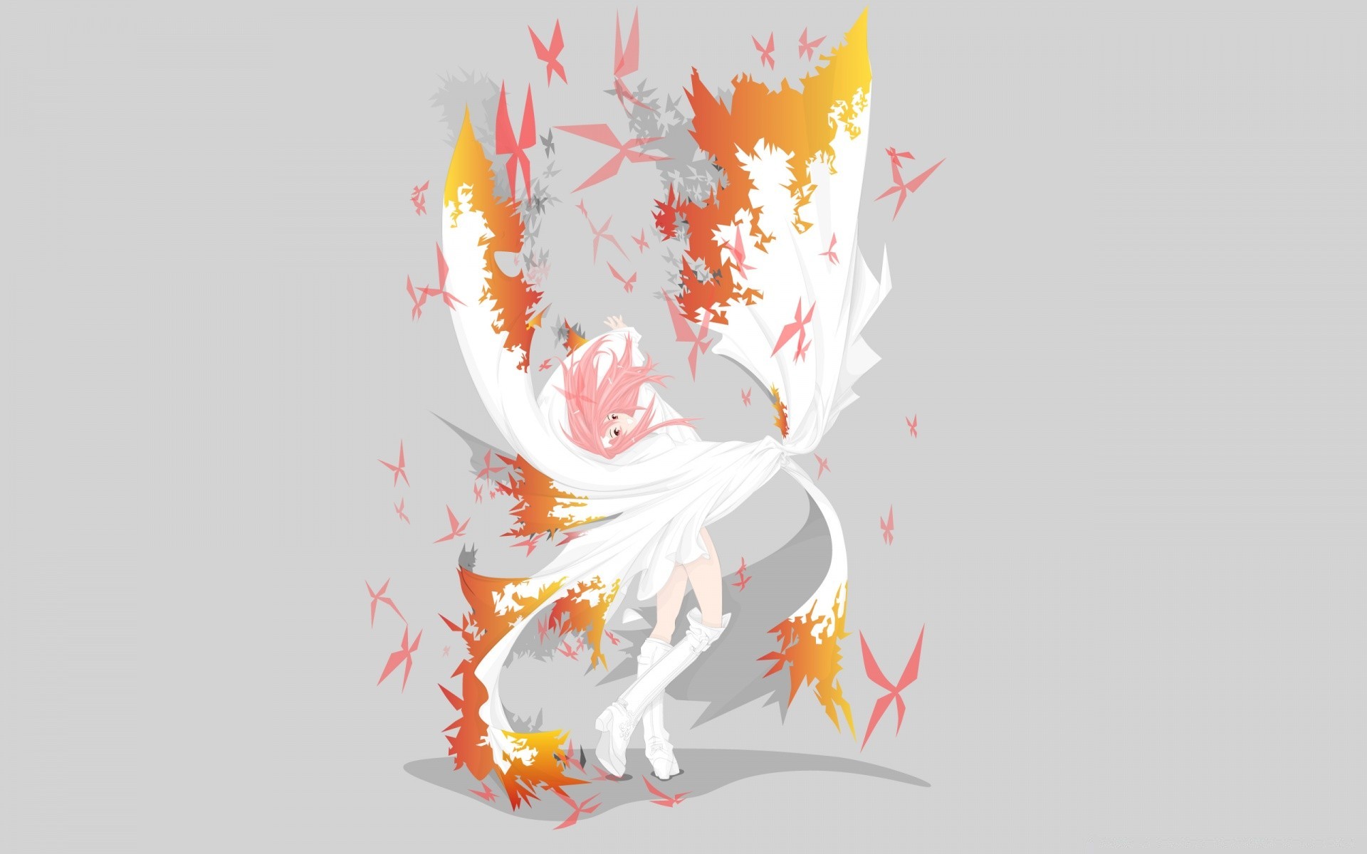 Kelebekler ile beyaz elbiseli pembe saçlı kız anime