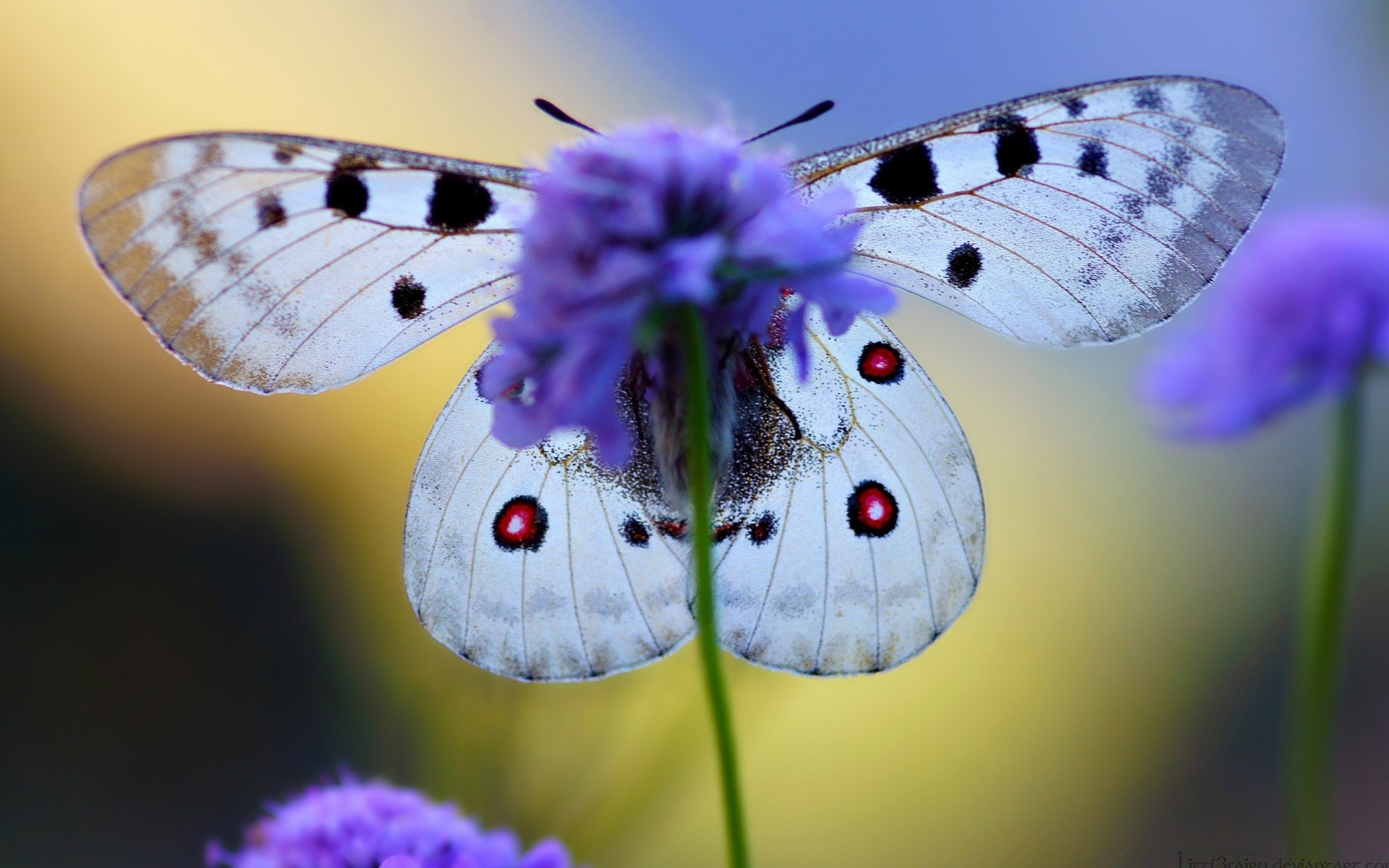 Mor çiçeğin üzerinde güzel beyaz kelebek