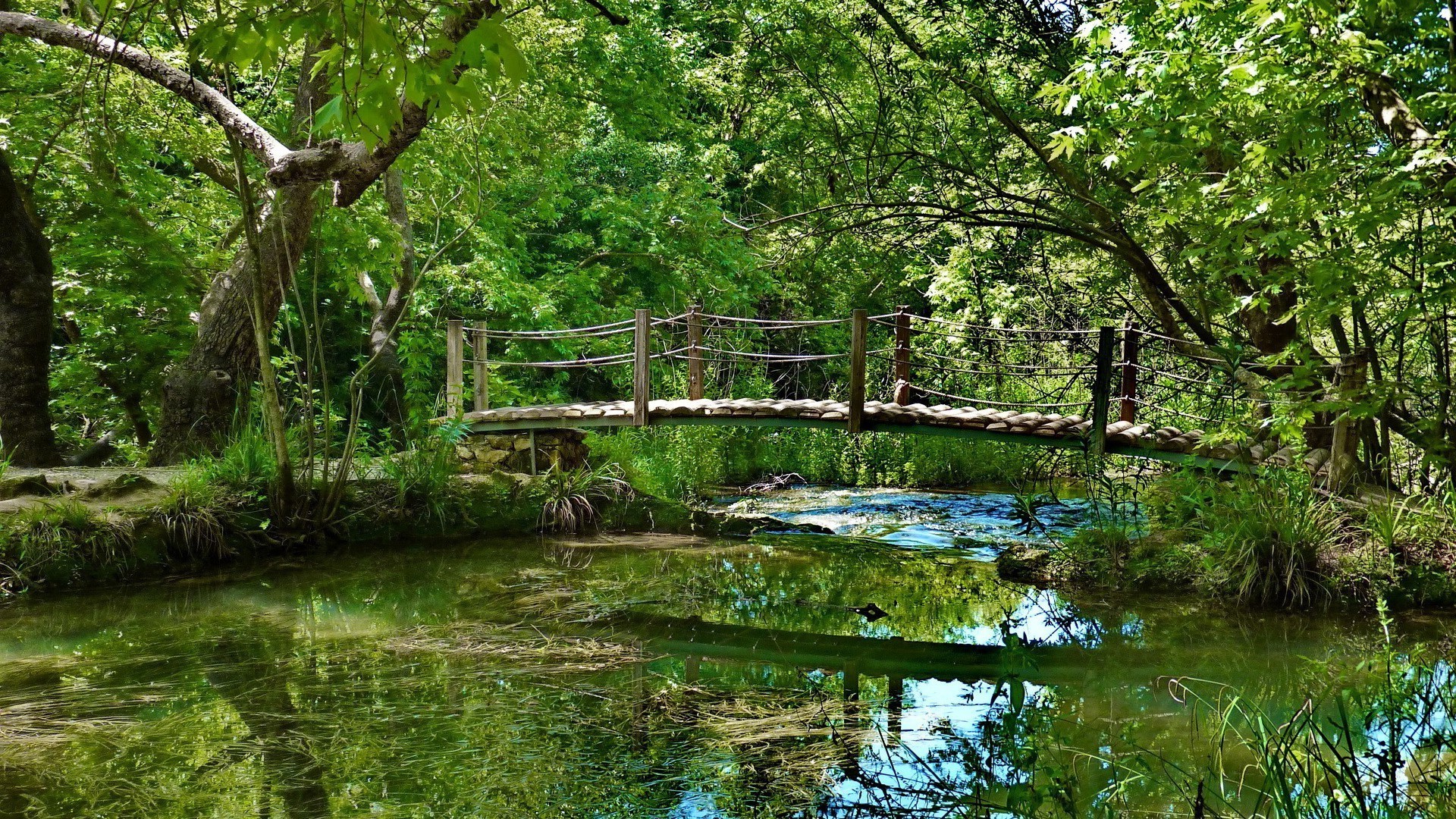 Göletin üzerindeki ahşap menteşeli köprü