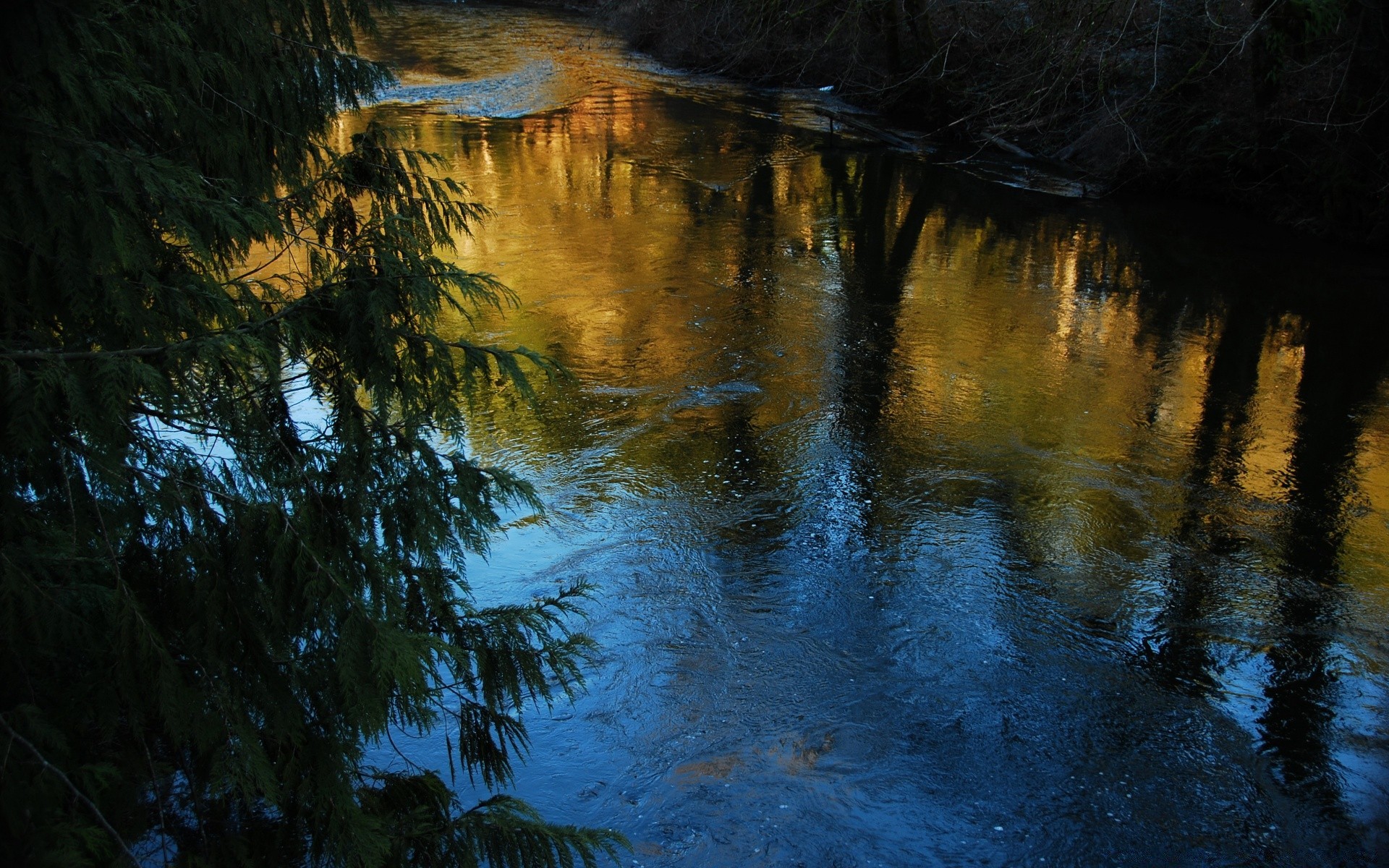 Kış akşamı nehir kenarında kızıl gün batımı