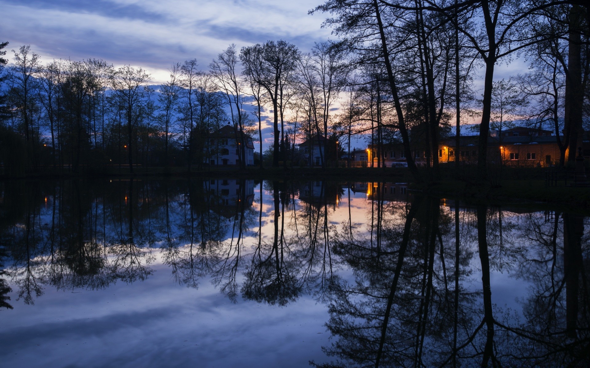 Orman gölünde gün batımının yansıması manzara