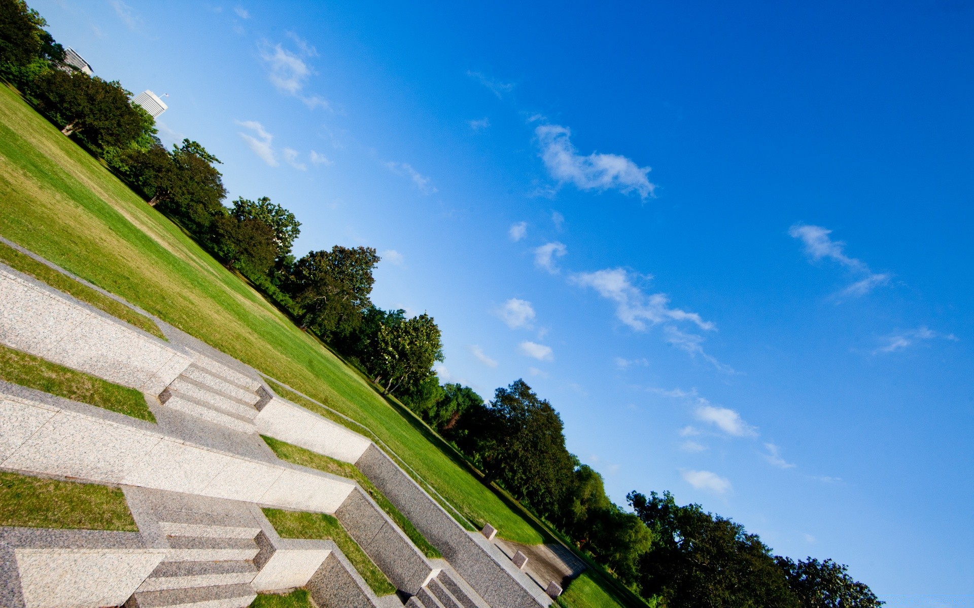 Yerdeki farklı seviyelerde düzgün bir şekilde biçilmiş çim ve ormancı