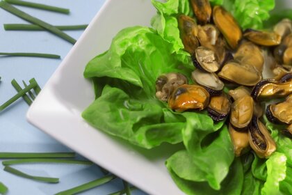 Yeşil salata ile tabaklara midye