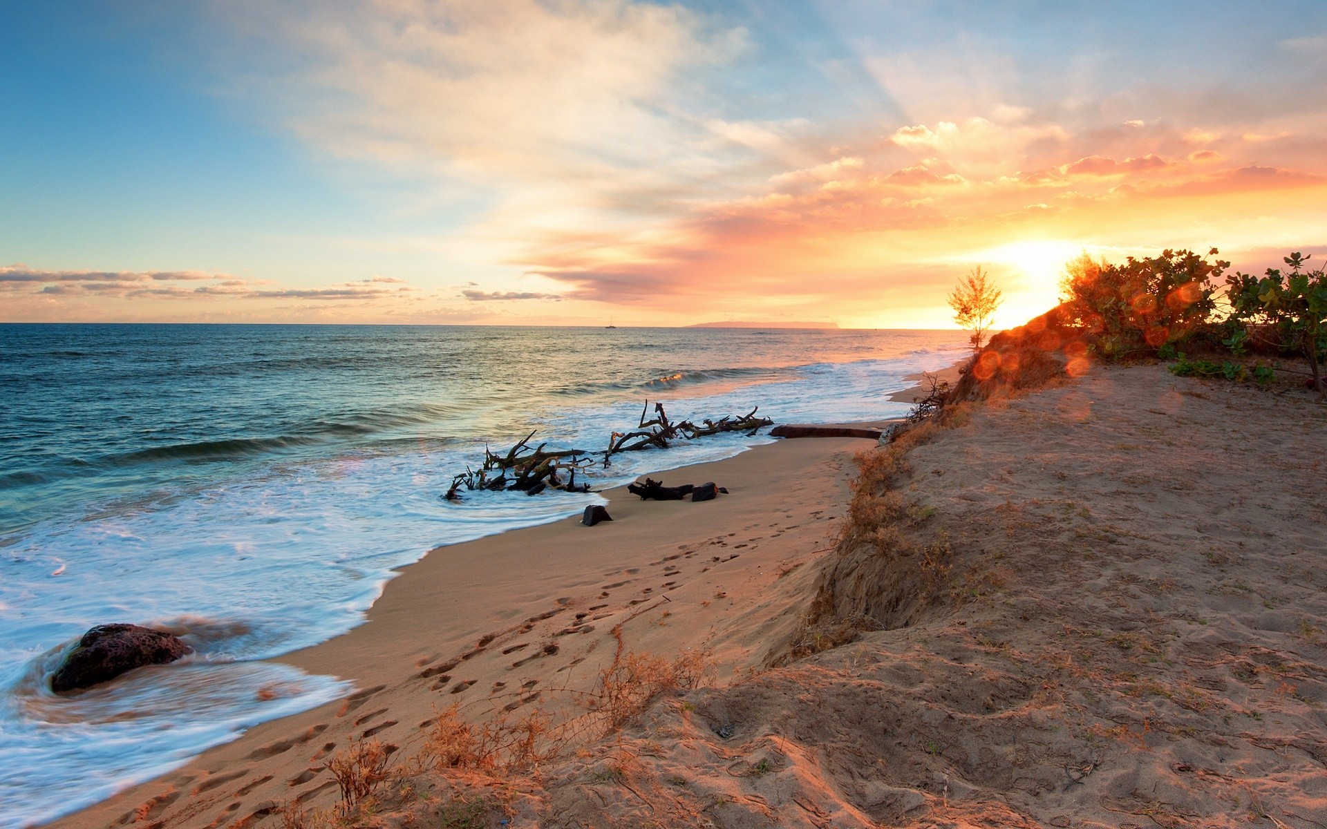 Kayalık plaj pembe gün batımını aydınlatıyor