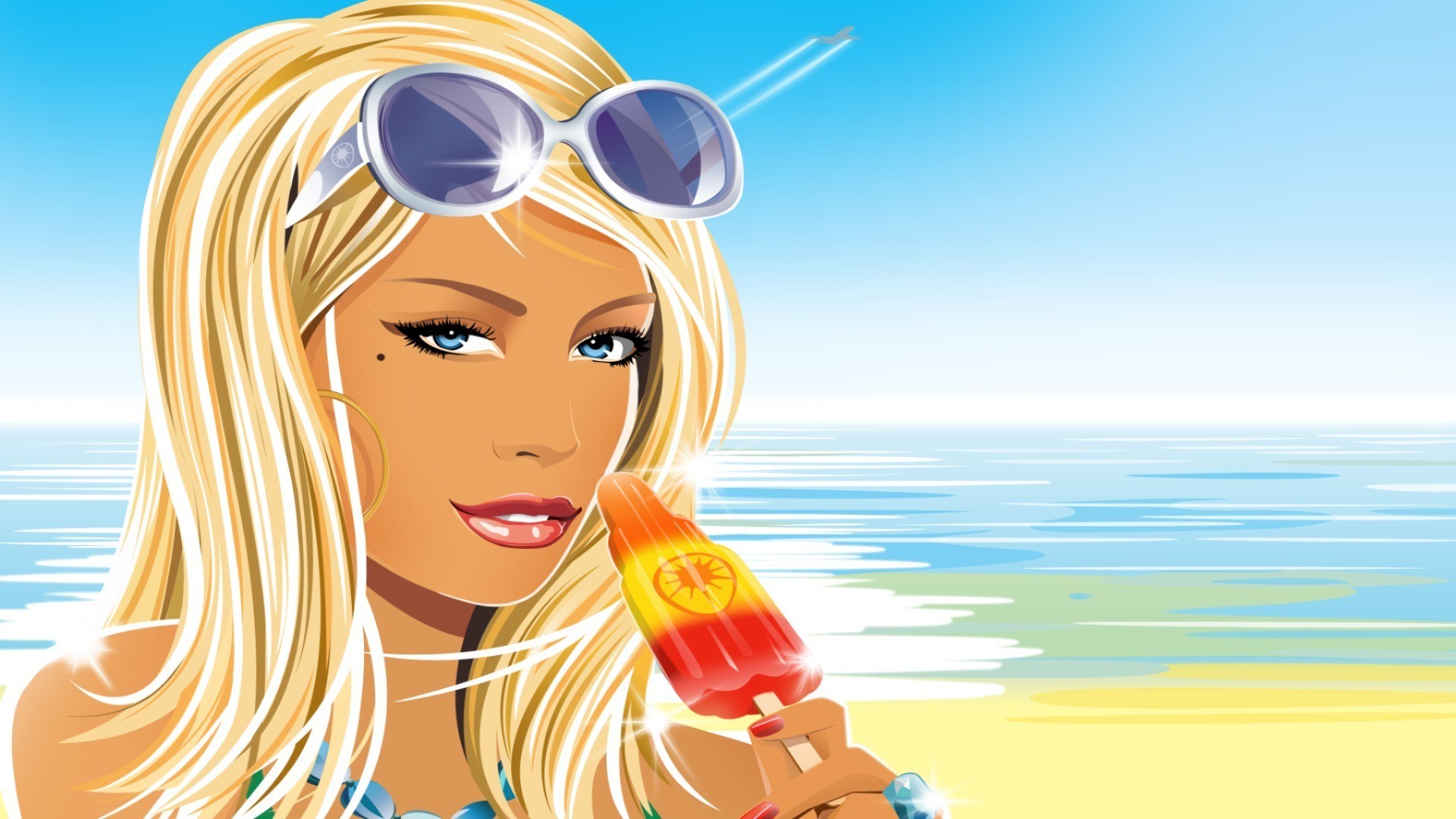 Sahilde bir çubuk üzerinde dondurma olan genç kız