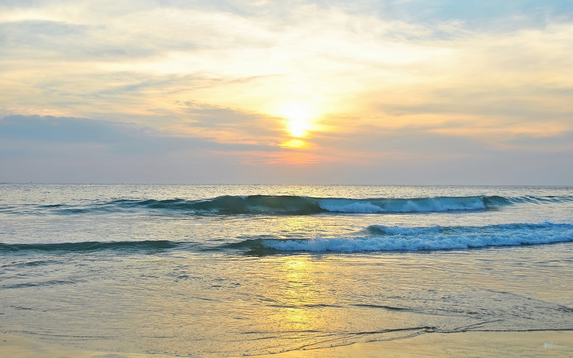 Okyanusun yanındaki plajda atmosferik gün batımı