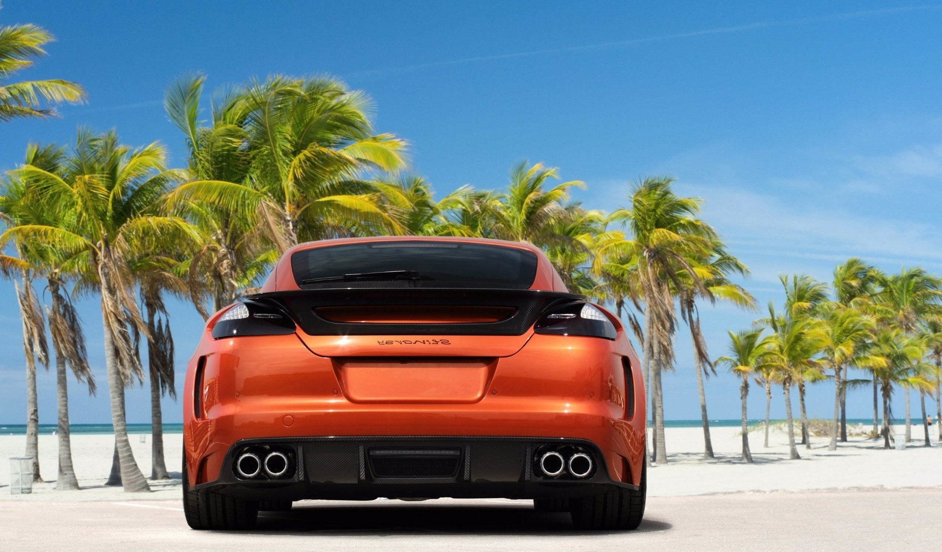 Kumdaki palmiye ağaçlarının arasında Porsche panamera