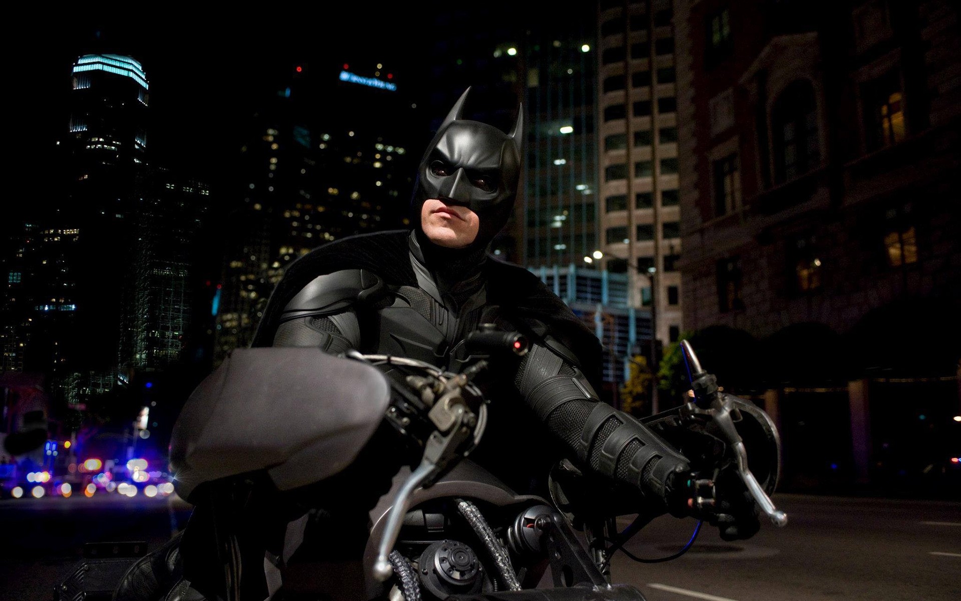 Batman, gece kasabasının zemininde siyah motosikletinde