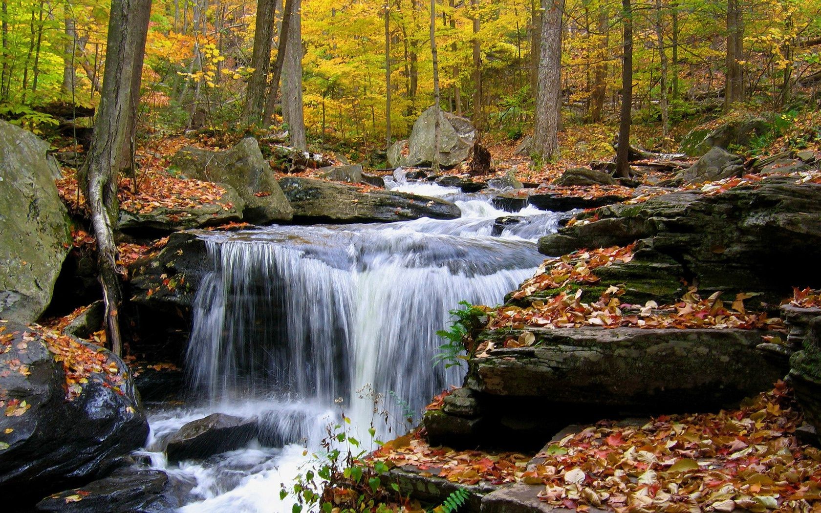 Sonbahar ormanında sakin bir nehirde sakin bir şelale