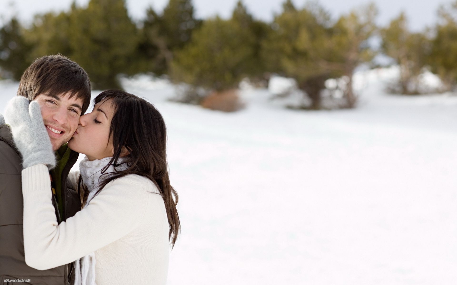 Kız karlı bir açıklıkta bir erkeği öpüyor