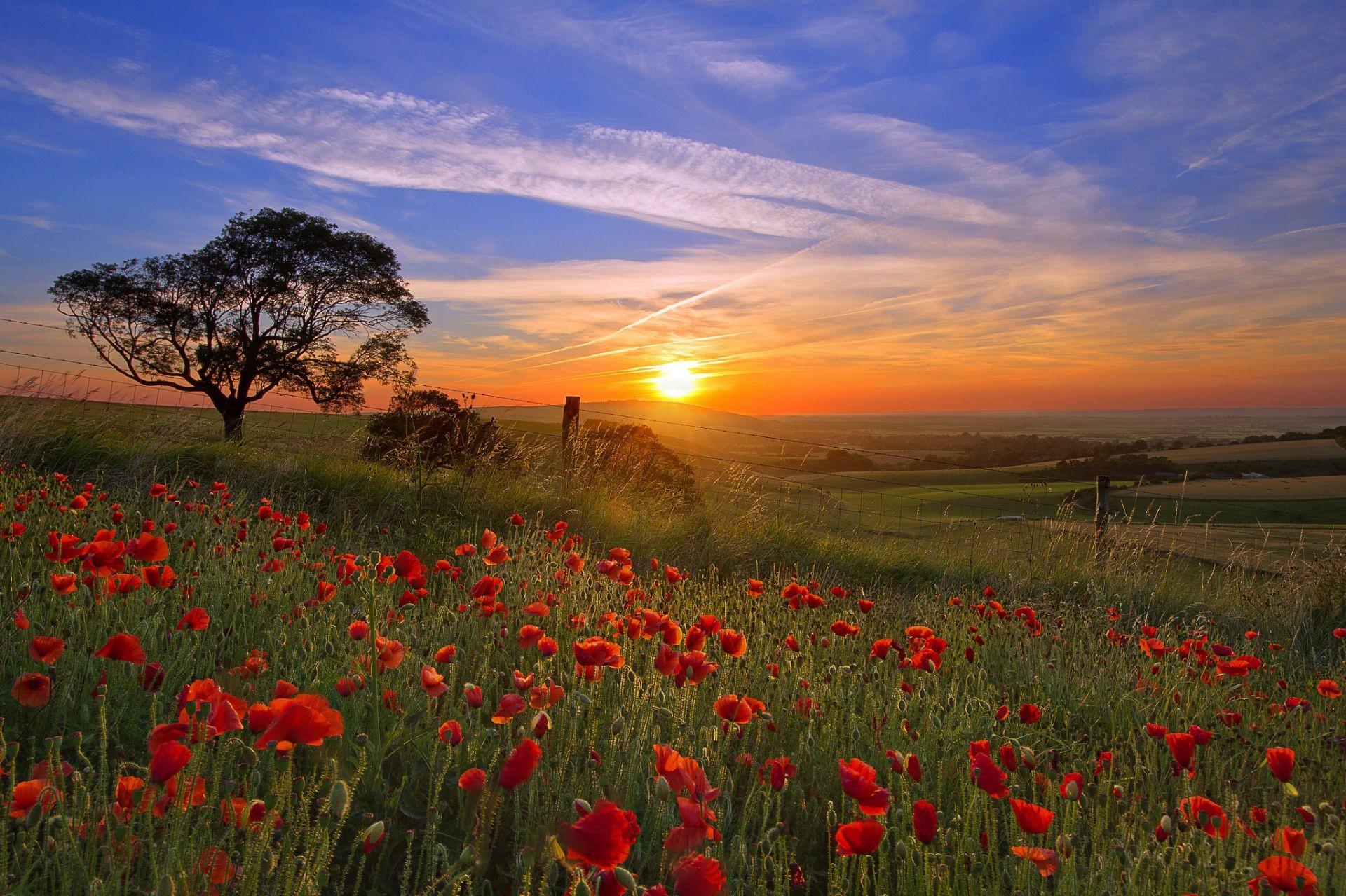 Gün batımının arka planında kırmızı haşhaşlı Glade