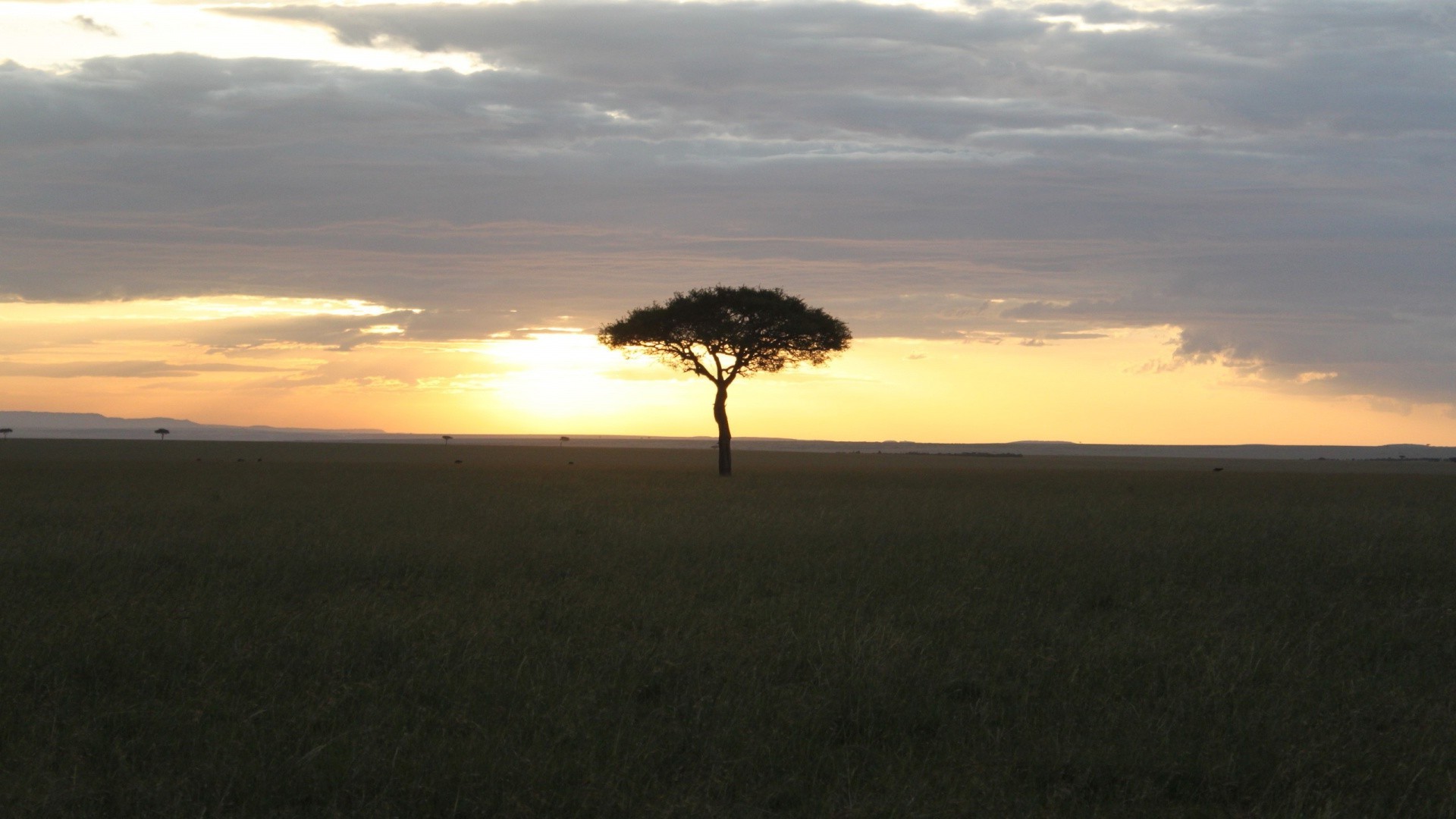 Gün batımı gökyüzünün arka planına karşı fener ve ağaç silüetleri