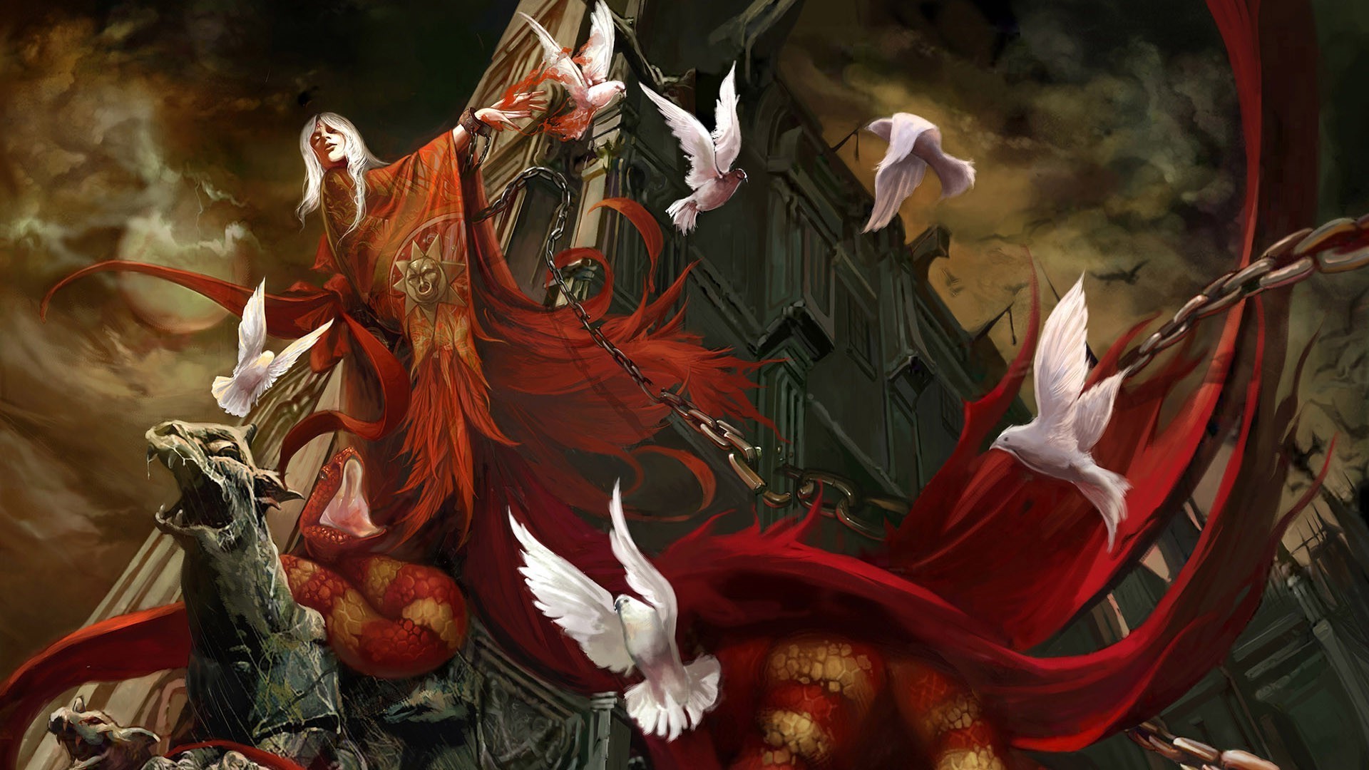 Büyücünün zincirinde zincirlenmiş olan bütün kırmızı cadı gülümsedi ve beyaz güvercinlere cezalarını verdiBüyücünün zincirinde zincirlenmiş olan bütün kırmızı cadı gülümsedi ve beyaz güvercinlere cezalarını verdi