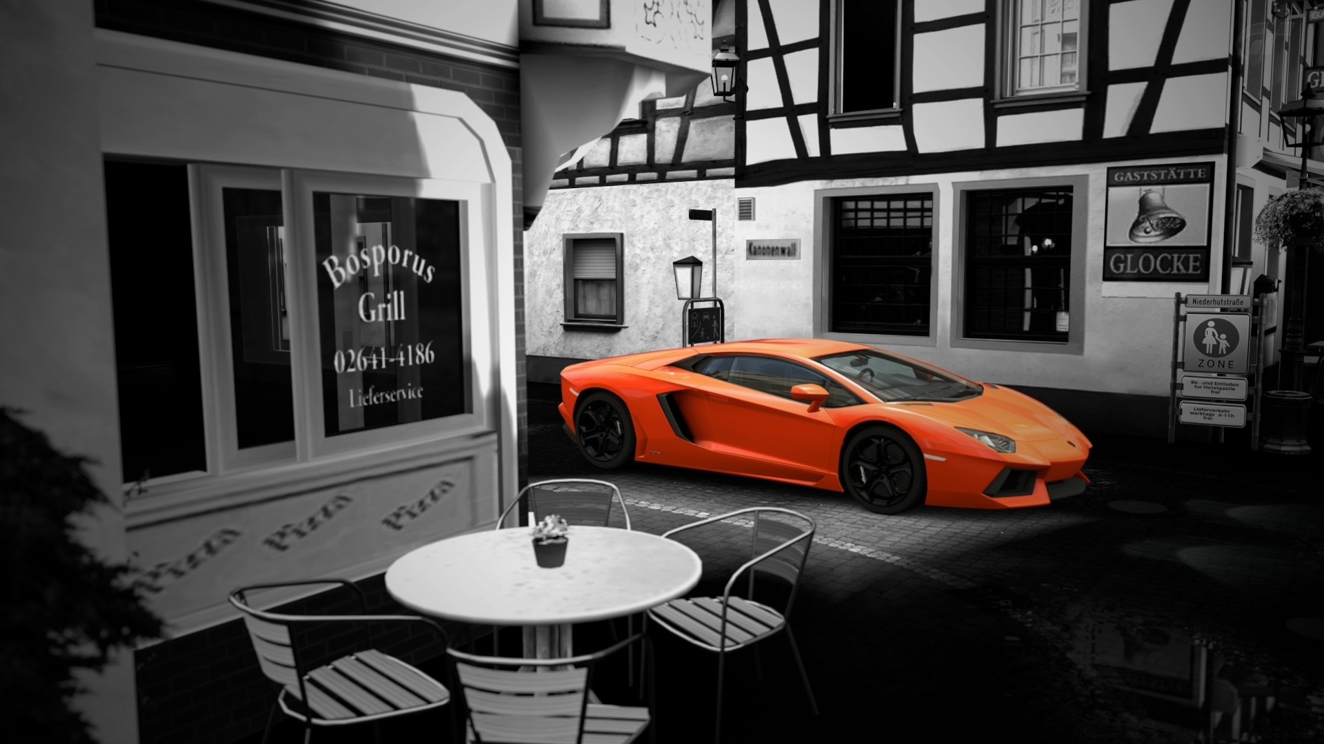 Şehrin siyah-beyaz sokaklarında kırmızı araba