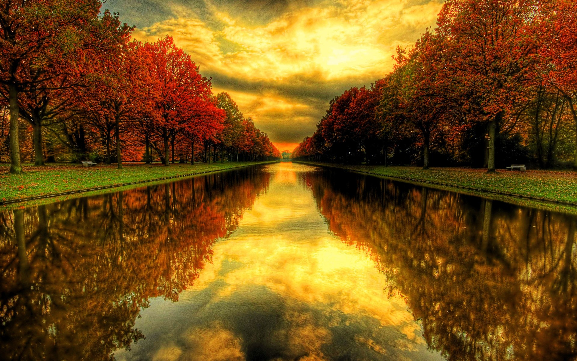 Göletin peyzajı ve sonbaharda yeşil sokaklar