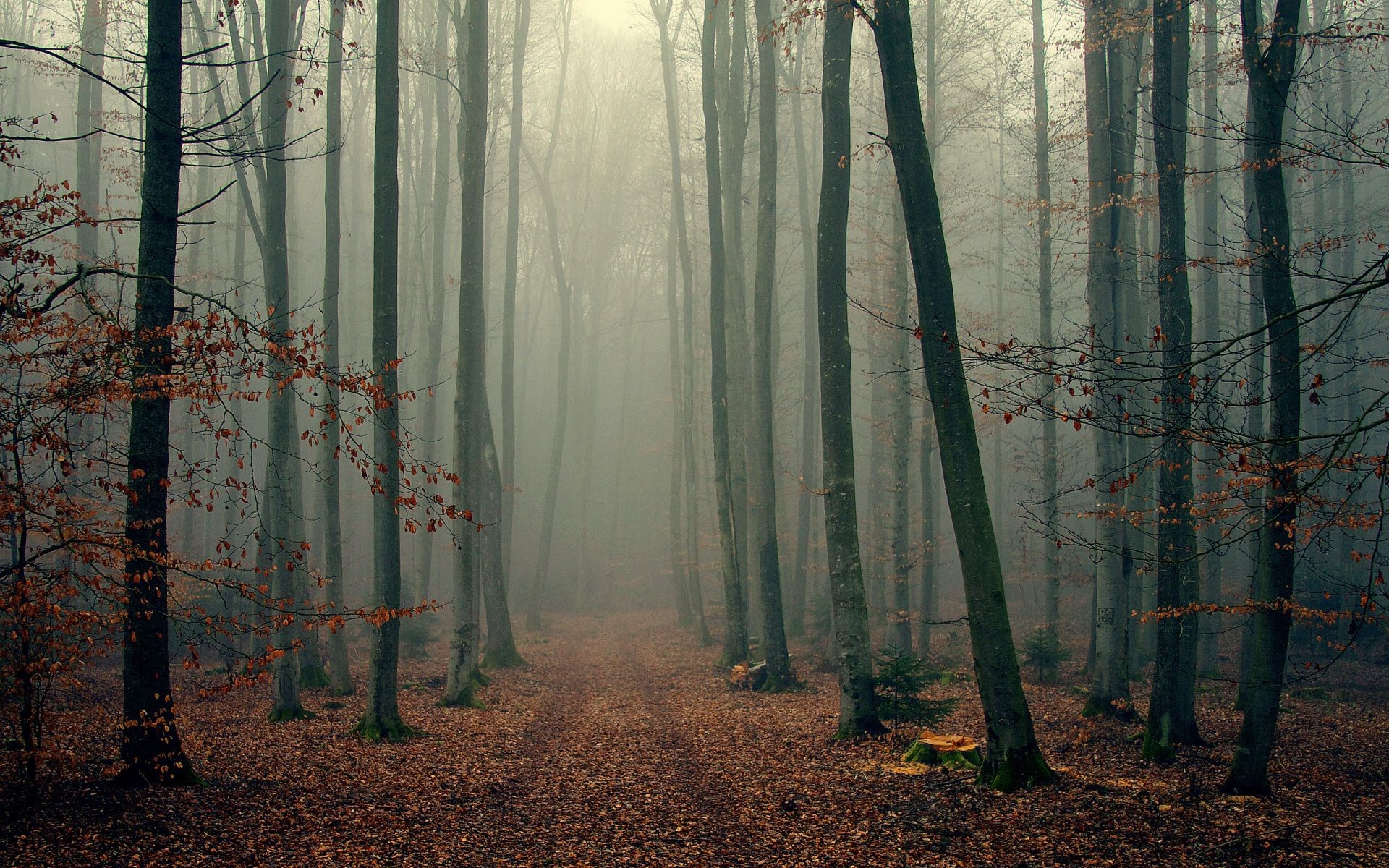 Sisli ahşap yeşillik ağaçlar sis orman sonbahar dalları