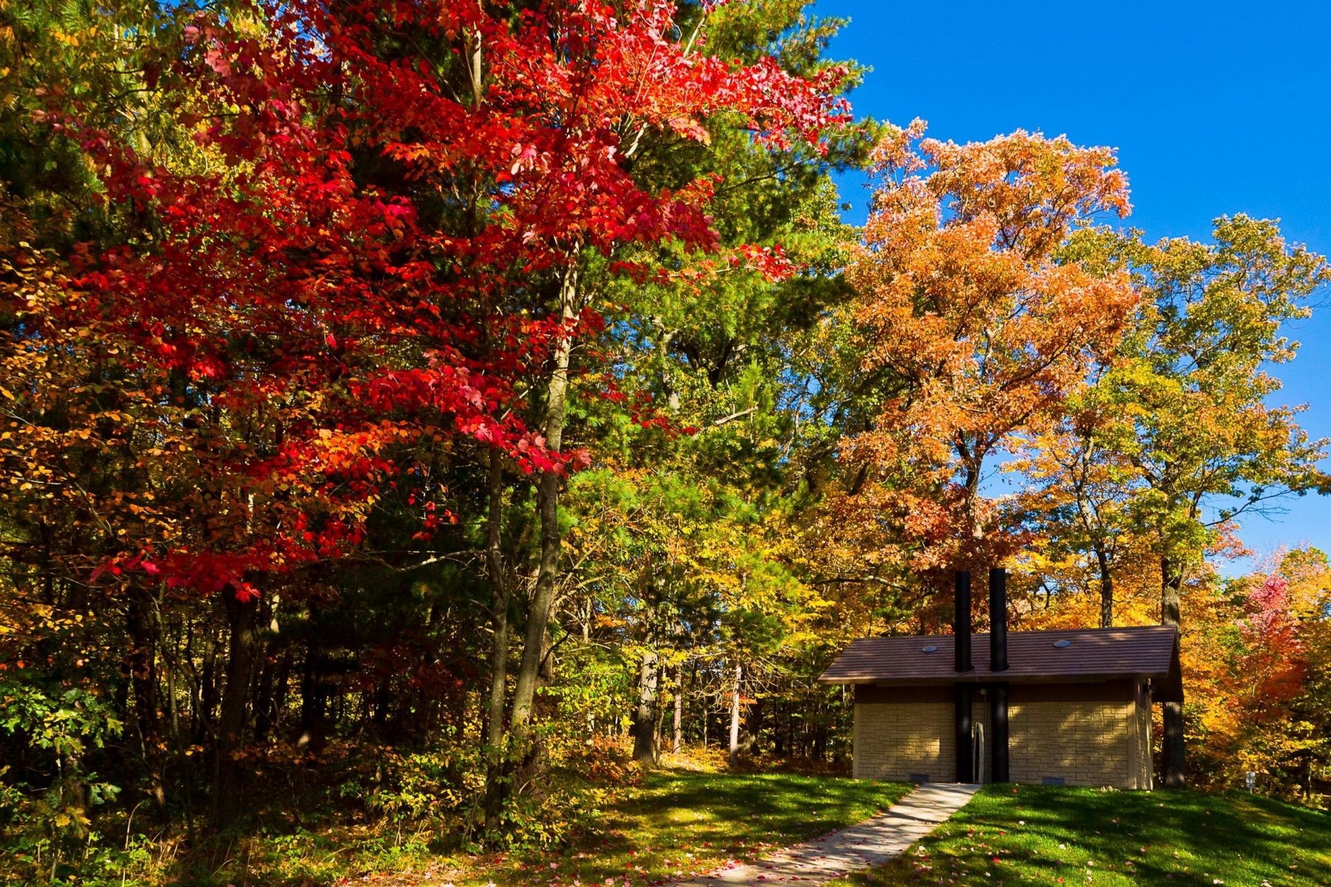 Sarı ve kırmızı yaprakları olan ağaçların sonbahar manzarasıSarı ve kırmızı yaprakları olan ağaçların sonbahar manzarası