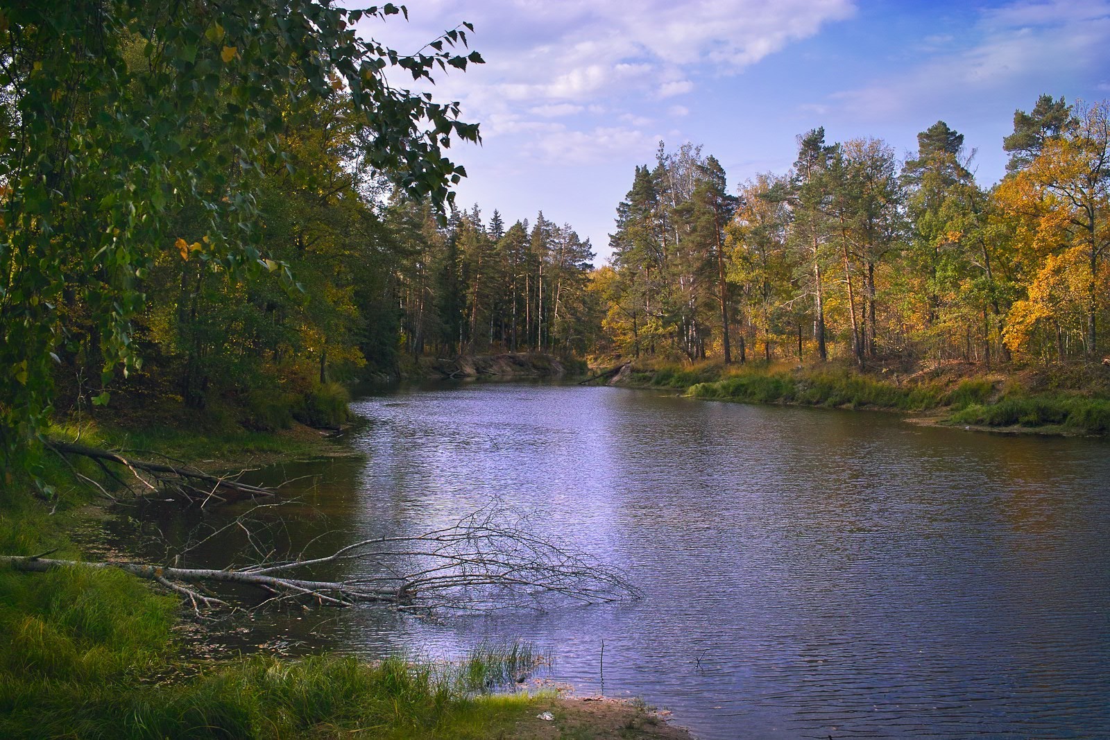 Gölün yanındaki ağaçlar. Sonbahar. Nehir